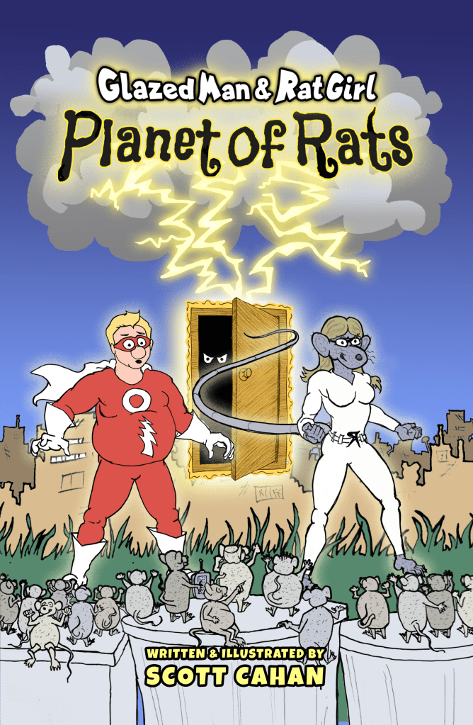 Power-hungry rats, killer robots, a mad scientist, and brainwashed humans? Something is definitely broken in Megalopolis! Johnny Crumb and Martha Maybee are having a quiet dinner together until their world goes crazy and they’re forced to skip dessert. Mankind is doomed unless two bumbling superheroes can save the day. Glazed Man and Rat Girl have the courage, the superpowers, the strong moral character, and the lack of common sense to stand against any evil, no matter how despicable. Good always triumphs over evil as long as Glazed Man & Rat Girl are on the scene!