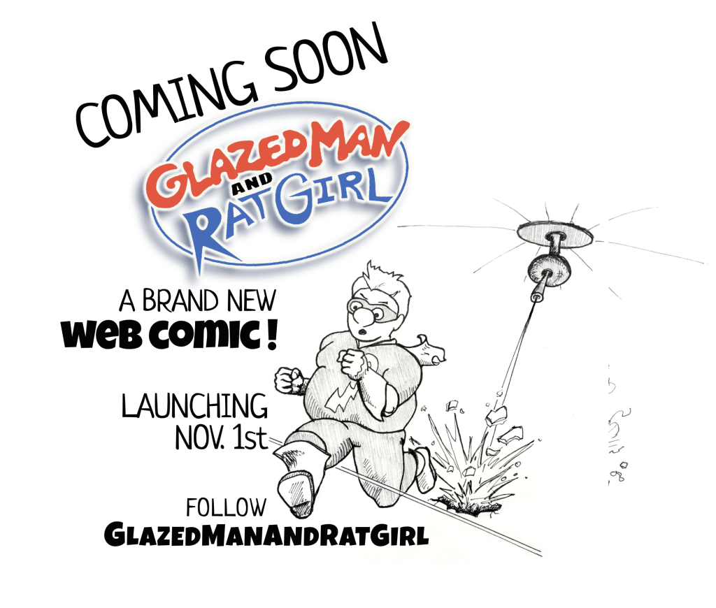 That brings me today, preparing to launch on November 1st. What, you might be asking is what is my web comic about? I decided to return to two characters that I established several years ago in my two first books, Glazed Man & Rat Girl. After completing my 2nd GM & RG book I often thought the series would make a great graphic novel. In other words, I wanted to do book 3 with all drawings and word bubbles rather than having pages of text in between the pictures. That is essentially what I’ll be doing with my new web comic. I’ll be creating book 3 in the GM & RG series, one web comic episode at a time. The story is continuous with each episode leading into the next. That means in a year or so, if things go as planned, I’ll have a complete story that I can compile and publish into book 3 in my Glazed Man & Rat Girl series, and best of all, it will be a full graphic novel.