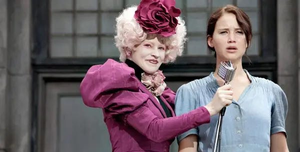- Hunger Games (the book) – We meet Katniss, Gale, and Peeta, learn about the lottery and how horrible the games are, and see Katniss volunteer to be a contestant to protect her sister. All of this happens in chapter one.